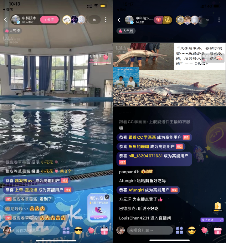 513日,活动在两场精彩的专题直播活动中拉开序幕。长江江豚是我国一级重点保护动物,被世界自然保护联盟(IUCN)列为极度濒危物种。球盟会(中国)白鱀豚馆科普志愿者彭博炜带领大家探访白鱀豚馆的微笑天使——长江江豚,普及江豚保护知识。中华鲟是长江中个体最大的鱼,有“长江鱼王之称,也是国家一级保护动物,但也有一种鲟在超市就能买到,这二者有什么区别呢?水生生物博物馆科普志愿者王熙、徐一扬以“鲟——从古至今”为主题,给大家讲解鲟类科普知识,探讨如何区分中华鲟与可食用鲟。